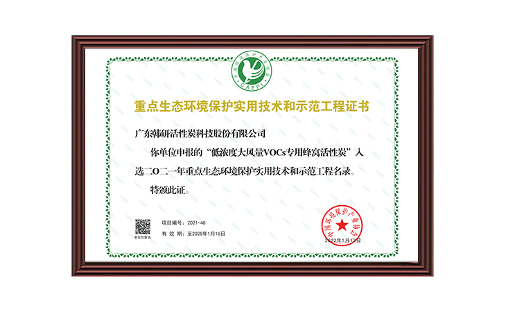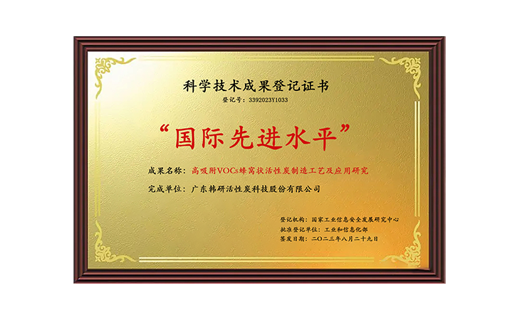 高吸附VOCs蜂窝状活性炭制造技术获国家工信部权威评定,达国际先进水平。